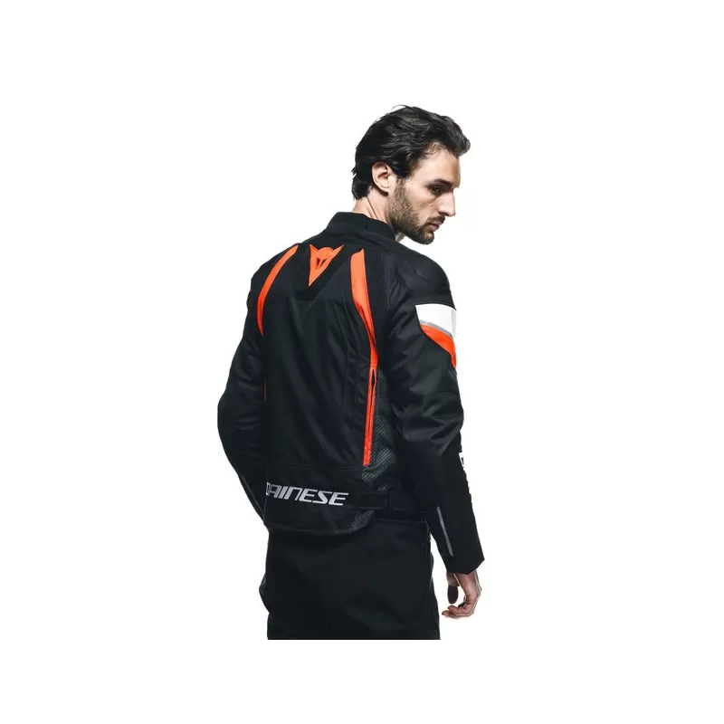 Giubbotto da moto in tessuto con fodera staccabile e zip di ventilazione, munito di protettori compositi, placche in PU e tasche per l'inserimento di protettori per torace e paraschiena. Dotato di Veloce Racing Neck, di cerniera di connessione a tutti i pantaloni Dainese e di tasca interna impermeabile. Certificato EN 17092 classe A.