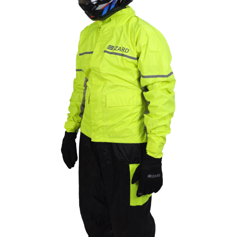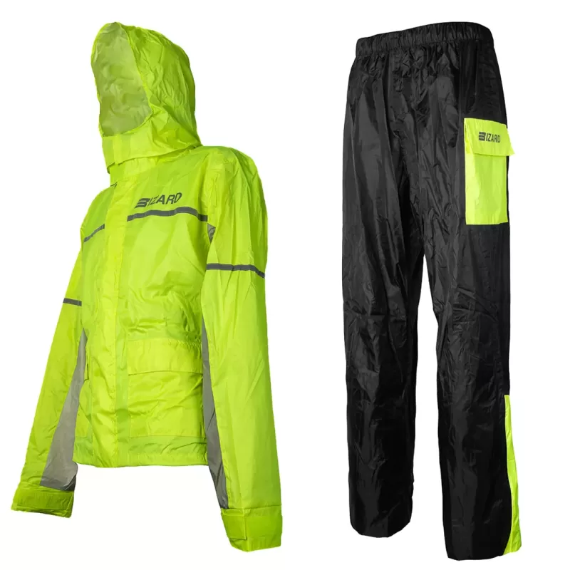 Set antipioggia in tessuto sintetico impermeabile a elevata colonna d’acqua, composto da giacca e pantalone.